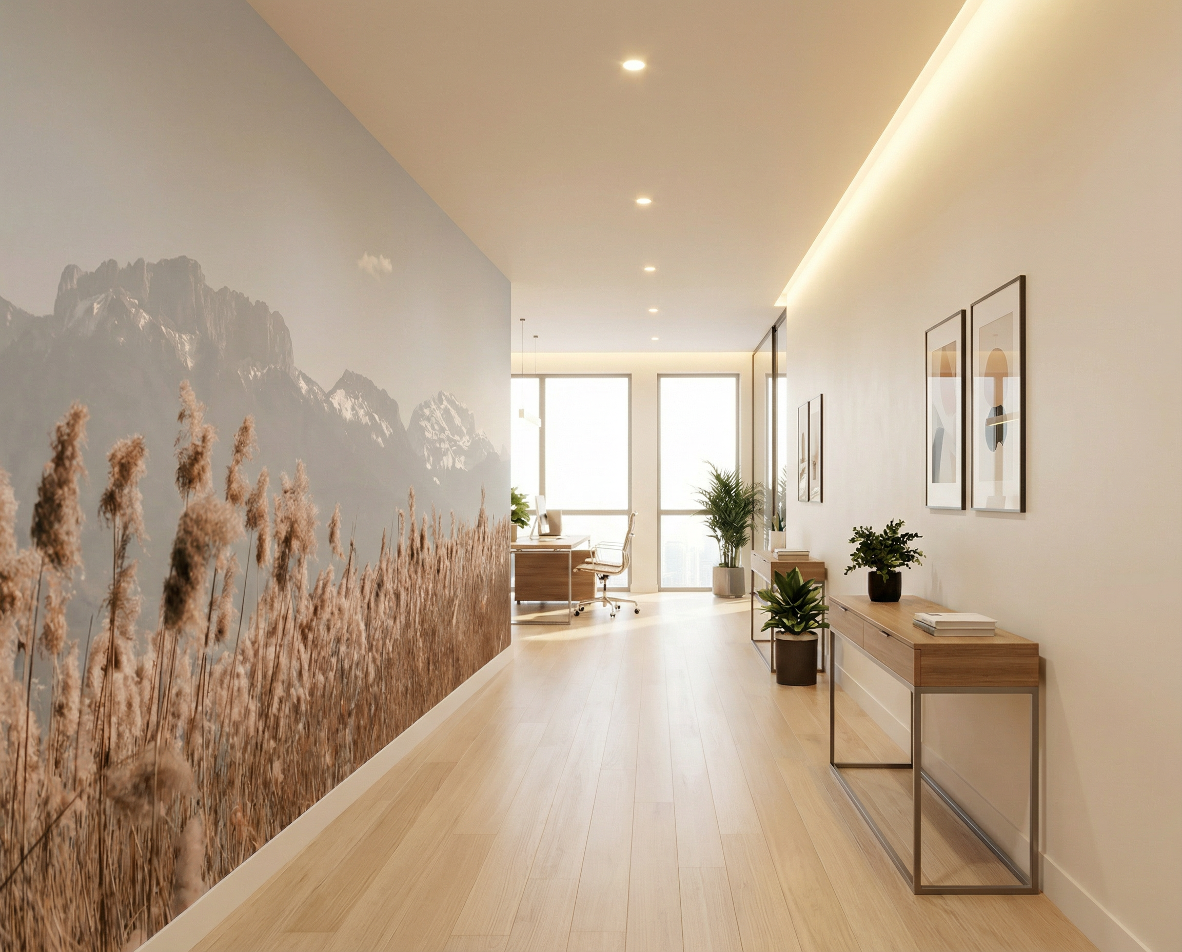 Its black and white design enhances every contour, playing with light to create an elegant and timeless atmosphere. Ideal for timeless wall decoration, this mountain wallpaper fits perfectly in a living room, bedroom, office, hotel lobby, or restaurant, bringing a touch of escape and serenity.