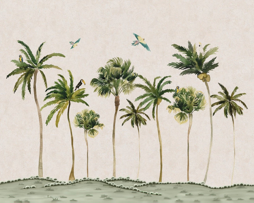 With its elegant palm trees painted in watercolor, this bedroom wallpaper creates a serene, exotic atmosphere, ideal for a restful space. In a corridor, it adds a touch of freshness and elegance, making every passage pleasant and luminous.