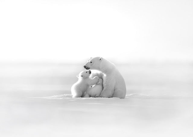 Transform your home with this panoramic wallpaper featuring a family of polar bears, ideal for cottage decor. Immerse yourself in a Nordic ambience as these majestic animals gracefully advance through immaculate snow, enveloped by a mysterious mist in the background.