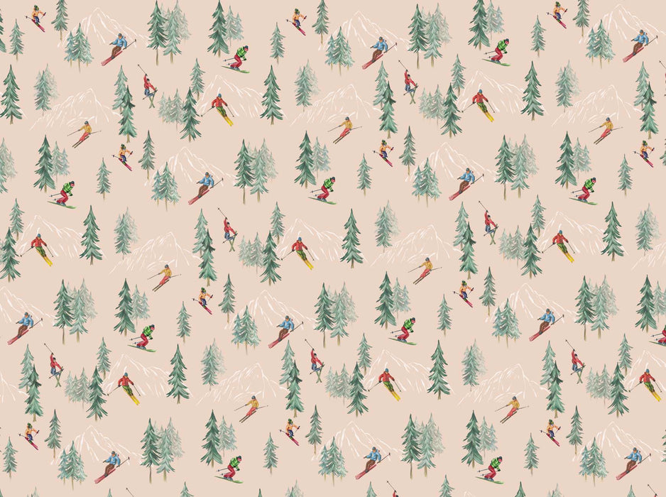 Discover mountain sports with our Alpine glisse pêche wallpaper. Representing winter sports with its skiers and fir trees, this panoramic wallpaper will find its place in every room of your home, but also in your establishment or chalet.