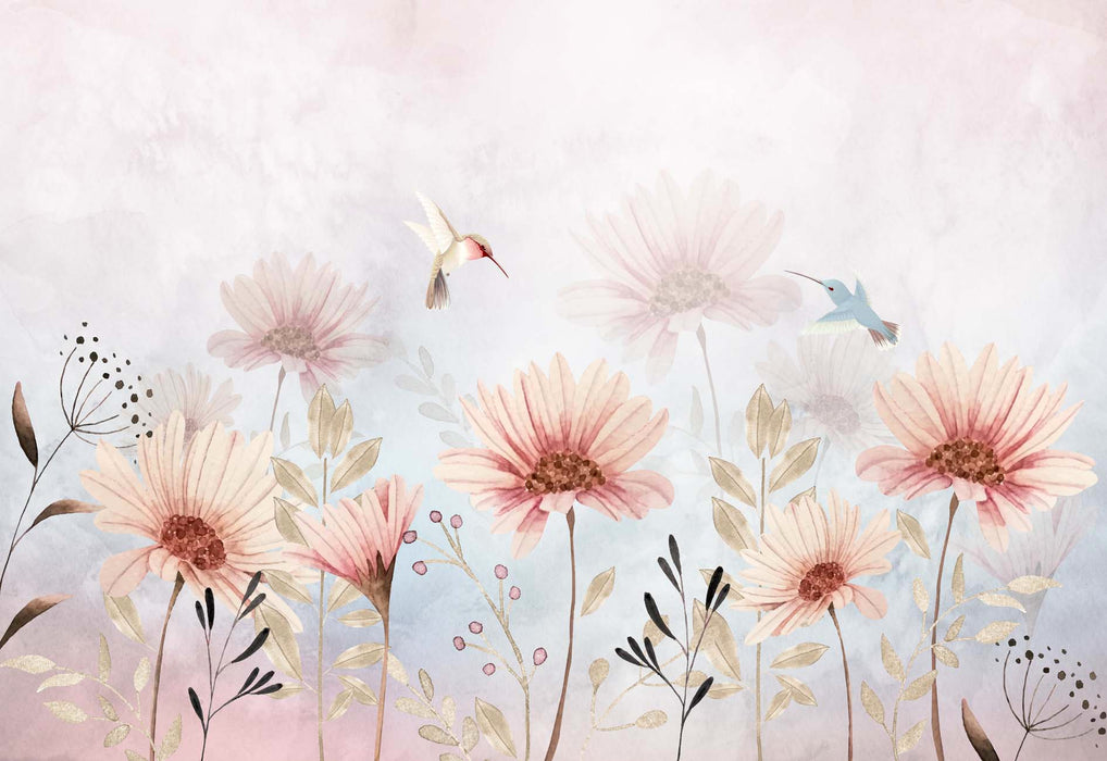 Take a deep breath of fresh air with our bucolic flowers & hummingbird wallpaper. This pastel-colored floral wall tapestry is ideal for a bedroom, headboard, living room or office. Put this floral mural in your kitchen to brighten it up. A made-to-measure wall decoration that will bring elegance, freshness and softness to your room. A single panoramic wallpaper to embellish your interior. This wallpaper is one of our deco addict wallpapers.