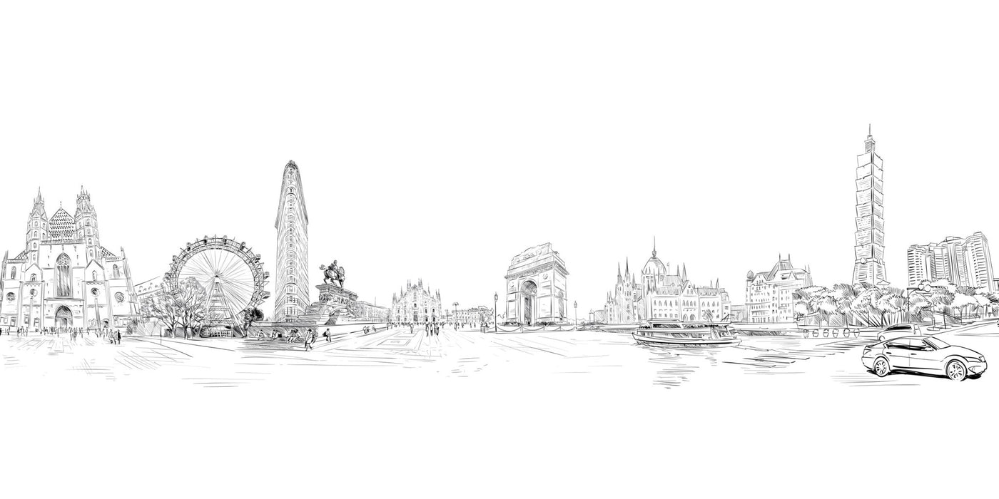 The monument of the world black and white wallpaper is a captivating work of art that captures the essence of the world's most iconic monuments in a uniquely designed style. The fine, detailed lines create an elegant, sophisticated contrast, ideal for contemporary interiors. Each monument, whether the Arc de Triomphe, the Colosseum or the Venice Canal, is depicted with artistic precision, bringing a touch of class and culture to any room. This bespoke panoramic wallpaper blends perfectly with modern furniture and minimalist decorations, adding visual depth without overloading the space. Perfect for a living room, office or bedroom, it transforms your wall into a window on the world, evoking dreams of travel and adventure. Transform your interior with class by installing our panoramic fresco.