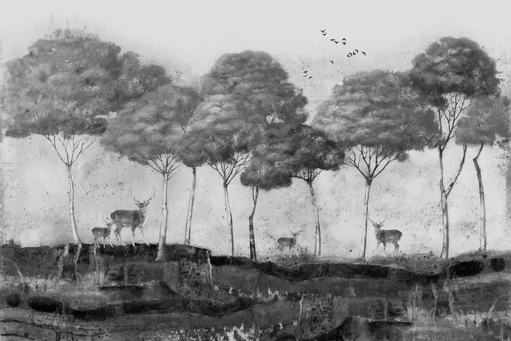 This panoramic non-woven Pines & Mystic Deer wallpaper is ideal for creating a spectacular wall decor in grisaille. Decorated in trendy black and white, this wallpaper is like a mural, a unique creation to dress up your walls. A wall fresco for an elegant, exotic style. Easily create a unique interior with our custom panoramic wallpaper