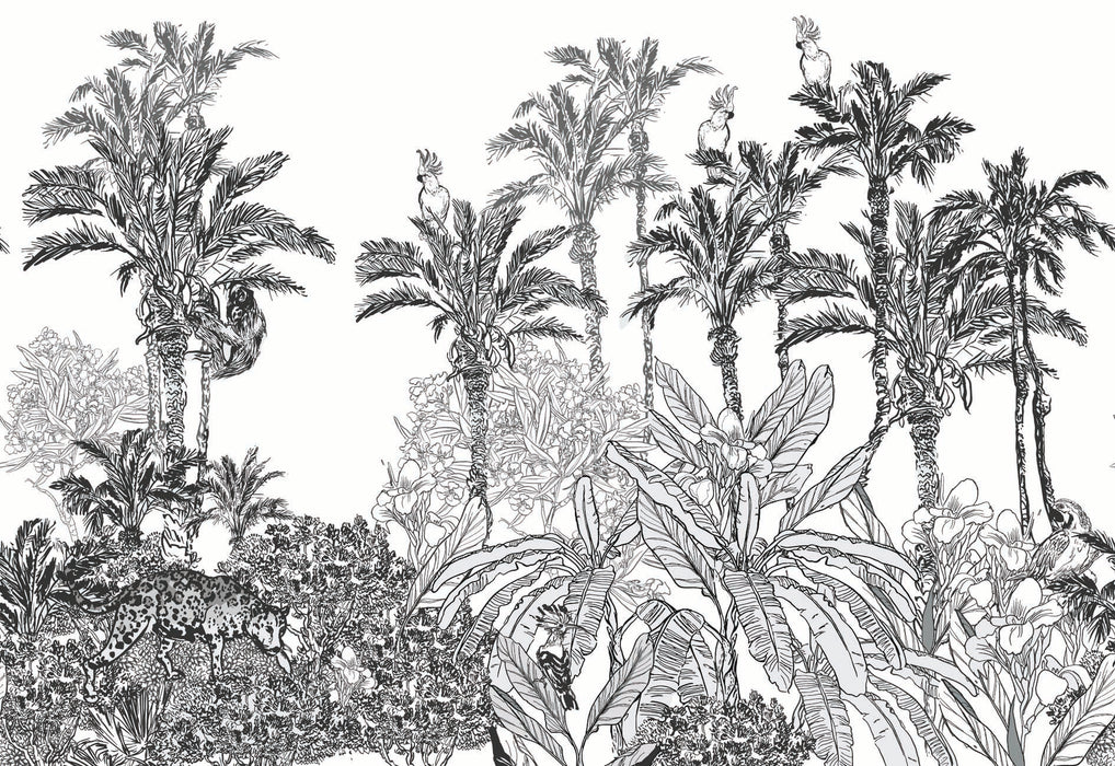 The wallpaper features a multitude of jungle animals, such as panthers, parrots, birds and monkeys, which blend harmoniously into the decor. Shades of gray soften the black and white lines, creating a striking, elegant contrast.