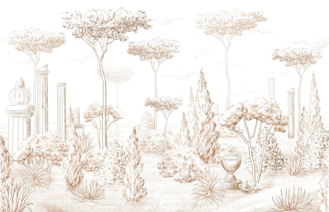 Our pencil-drawn sepia-engraved Roman pinewood panorama wallpaper is a true masterpiece that will add a touch of sophistication and charm to your interior. The finesse of the pencil strokes gives an impression of delicacy and precision, while the depiction of pine trees evokes the classic beauty of Roman gardens.