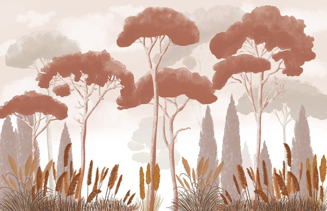 This cypress, pine and terracotta pampas grass wallpaper will plunge you into the heart of nature and create a unique environment. Give your interior a trendy, elegant and fresh look with this artistic and warm panoramic wallpaper, a mural effect that will amaze your friends! This panoramic wallpaper will sublimate any room in your home, making it the main feature of your decor. Easily create a dream interior with our wall tapestry made to the dimensions of your wall.