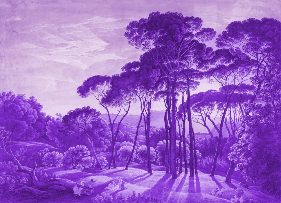 Purple Italian landscape wallpaper, this custom panoramic wallpaper is perfect for elegant, contemporary interiors with old-world designs. We've designed it in a violet color to bring modernism and dynamism to this artistic mural. Buy panoramic wallpaper online to personalize your interior. In a living room, bedroom or office, this panoramic mural will add both style and sophistication to your decor. Discover this famous, historic Italian landscape with umbrella pines, a painting by Hendrik Voogd1807. A panoramic wallpaper bathed in golden light and emotion.