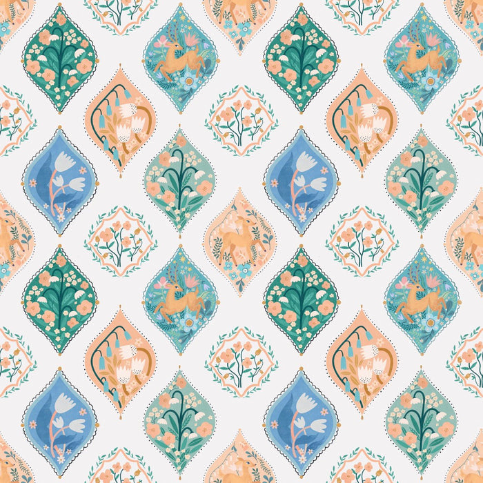 Discover the magical arabesque children's wallpaper! A wall composition with incredible arabesques: leaves, flowers, animals. This splendid and original wall decor will perfectly decorate your child's bedroom with taste and softness. In a playroom, a nursery or even a baby's room, the motifs on this arabesque children's wallpaper are magical and enchanting.
