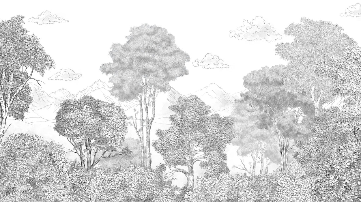 Immerse yourself in elegant, refined wall décor with "Évasion Française - Forêts et Monts Crayonnés", a panoramic wallpaper that revisits the tapestry of yesteryear with a modern, artistic style. Inspired by France's natural landscapes, this pattern features hand-drawn, bushy trees and majestic mountains in the background, reminiscent of ancient mural frescoes. This timelessly charming French wallpaper brings a touch of sophistication and authenticity to any space, transforming your interior into a true natural haven. Ideal for a classic yet contemporary ambience.