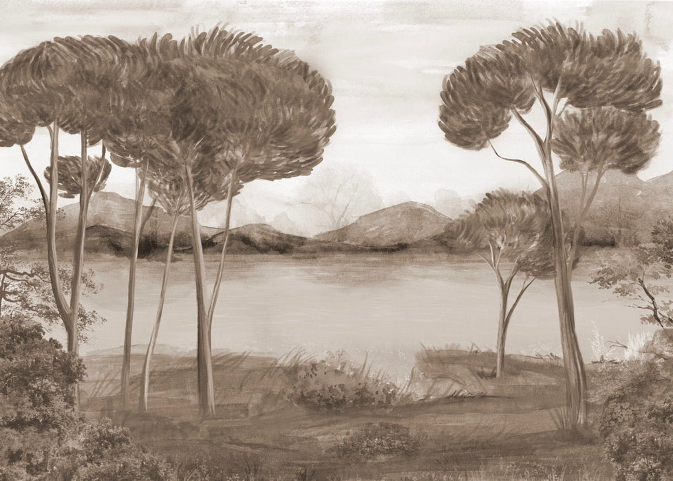 Immerse your interiors in timeless elegance with this sepia panoramic wallpaper, inspired by Mediterranean landscapes. Slender umbrella pines stand at the edge of a peaceful lake, in a refined pictorial style reminiscent of ancient Italian frescoes.