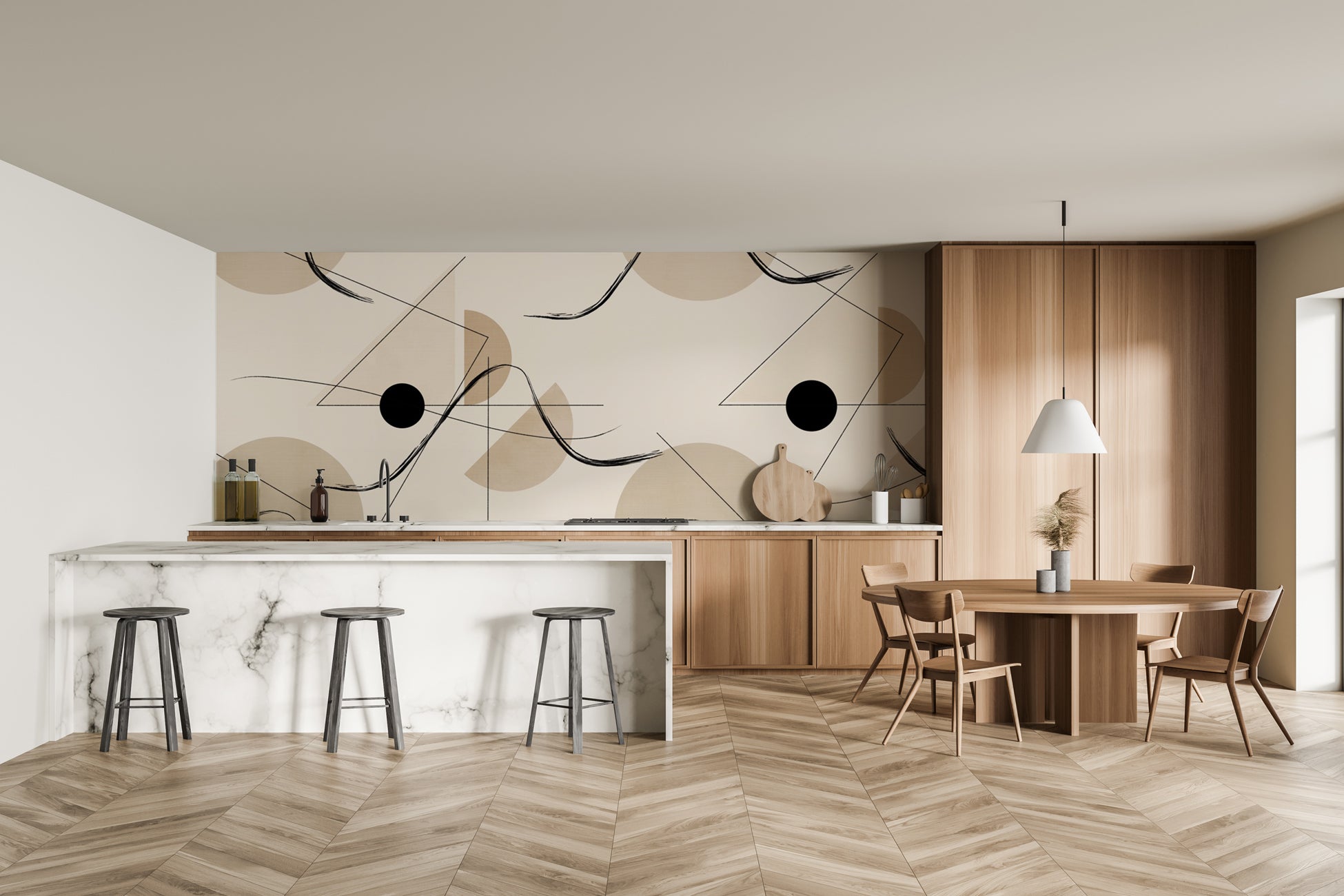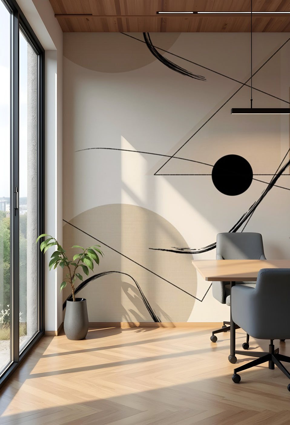 Ses teintes douces de beige sable, associées à des lignes noires et des formes géométriques subtiles, en font un papier peint idéal pour une cuisine design, un salon contemporain, une salle à manger, un bureau ou un espace professionnel. Il s’intègre parfaitement dans des intérieurs minimalistes, naturels, wabi-sabi ou haut de gamme.