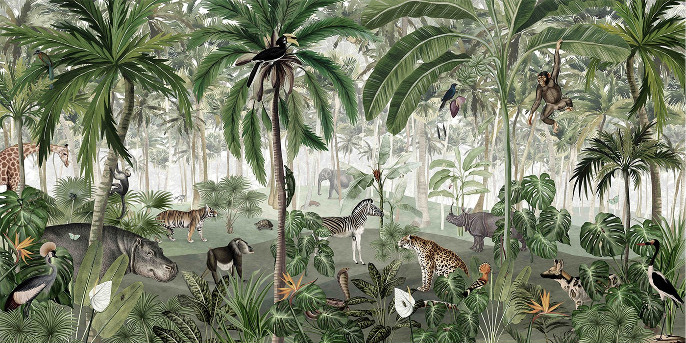 Our Harmony of Animals baby wallpaper is a children's mural paying homage to nature. On this endearing panoramic custom-made wallpaper, discover life-size jungle animals strolling around. This jungle animals wallpaper for baby has been thought through to the smallest detail, so that your child can develop his or her senses while looking at his or her new wall. Soft curves, delicate, warm colors, share moments of happiness in your child's room, in the company of this animal wall mural for kids.