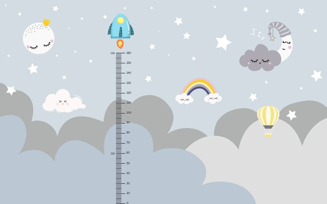 Discover our girl's bedroom wallpaper and toise. This wallpaper for a child's bedroom is also ideal for a nursery or playroom. A mixed-media wall decor that will follow your child as she measures up to the sky's elements. This panoramic French wallpaper evolves with baby's age. A wall fresco to liven up your room and entertain your child. Choose a healthy, eco-friendly made-to-measure wallpaper to decorate your child's bedroom.
