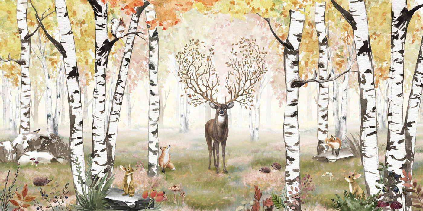 With the magic forest children's wallpaper, plunge into a fairytale world designed and thought out especially to fill the rooms of babies and children with wonder. This abstract depiction of a bewitching forest captivates hearts with slender birch trees, bright flowers and adorable wildlife including rabbits, small birds and a curious fox. At the center of this enchanting scene, a magnificent stag with flowering antlers reigns supreme.