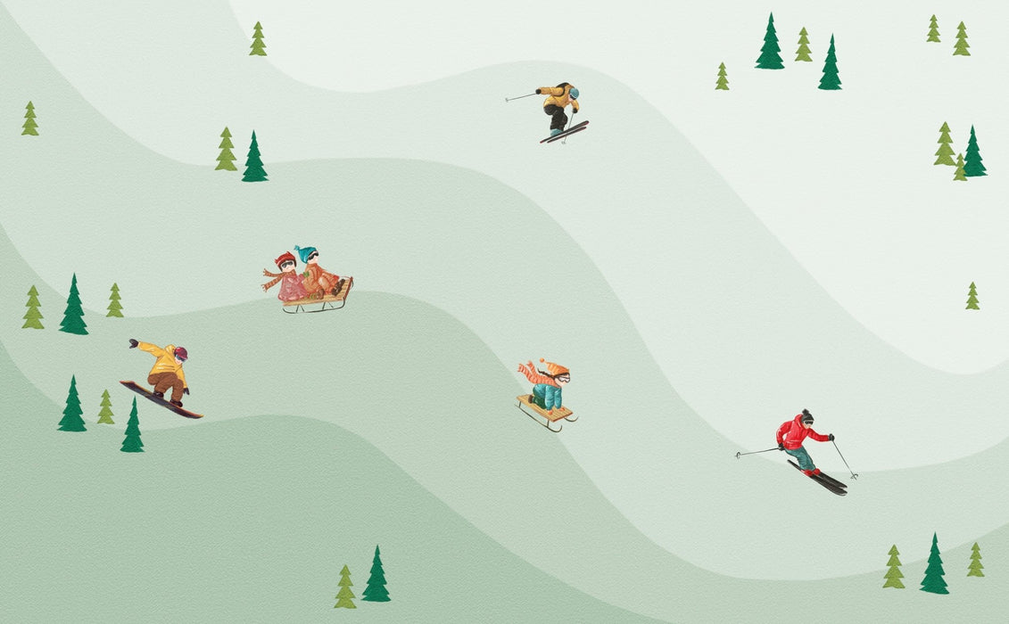 Discover our green skiers wallpaper, perfect for creating new adventures in your child's bedroom. This green wallpaper is adorable: skiers, freeriders, fir trees, moving down a ski run... All the elements are here to decorate and transform your child's bedroom with style and taste! The motifs are designed for children and teenagers. The wallpaper is available in a range of colors to suit every taste!