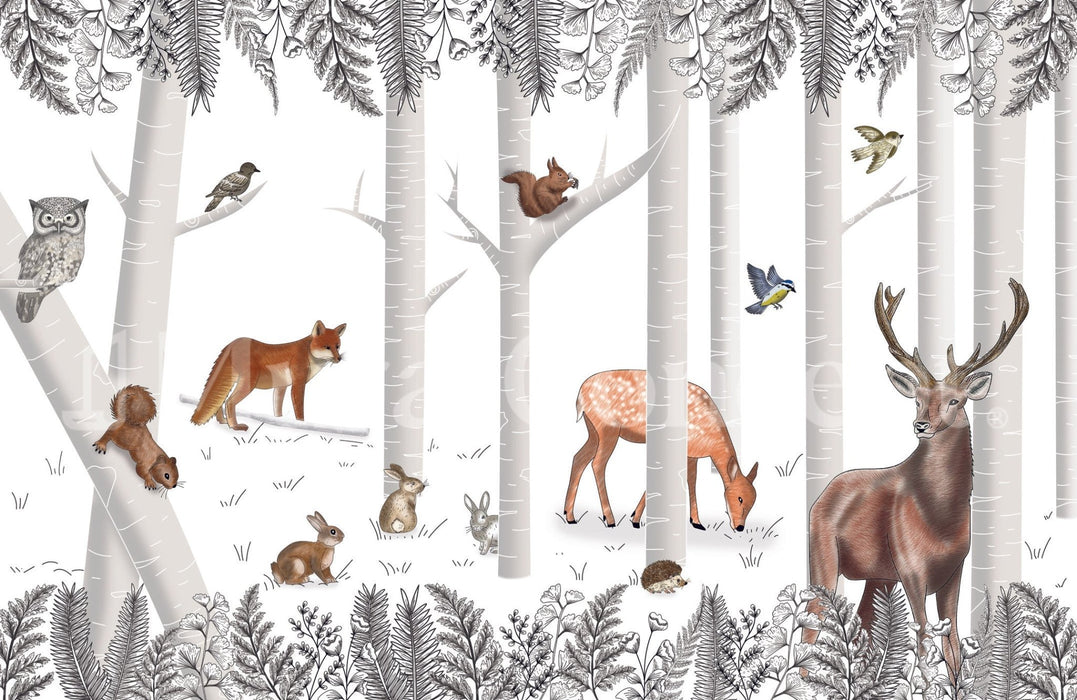 With our enchanted wood and animals wallpaper, it's as if you're entering a forest glade. A multitude of endearing animals are drawn on this panoramic wallpaper, including squirrels, deer, rabbits and hedgehogs. So many companions to accompany your child through the night. The natural colors of this wall creation make it easy to match the room's decor.