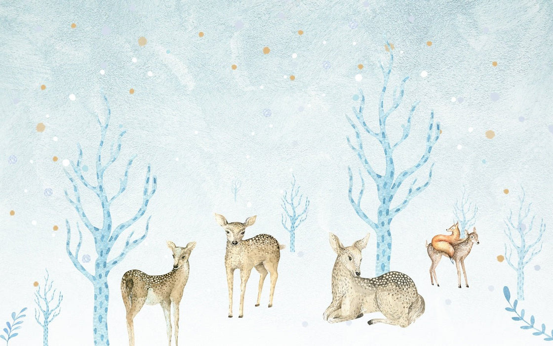 Discover our forest blue and fallow deer baby room wallpaper. This XXL tapestry is ideal for a child's bedroom, baby's room or playroom. A wall decoration that will tell sweet stories and bring tenderness to your room. A wall fresco to personalize your room and make it warm and inviting. This eco-friendly wallpaper is ideal for a baby's room. A healthy wallpaper for a natural environment.