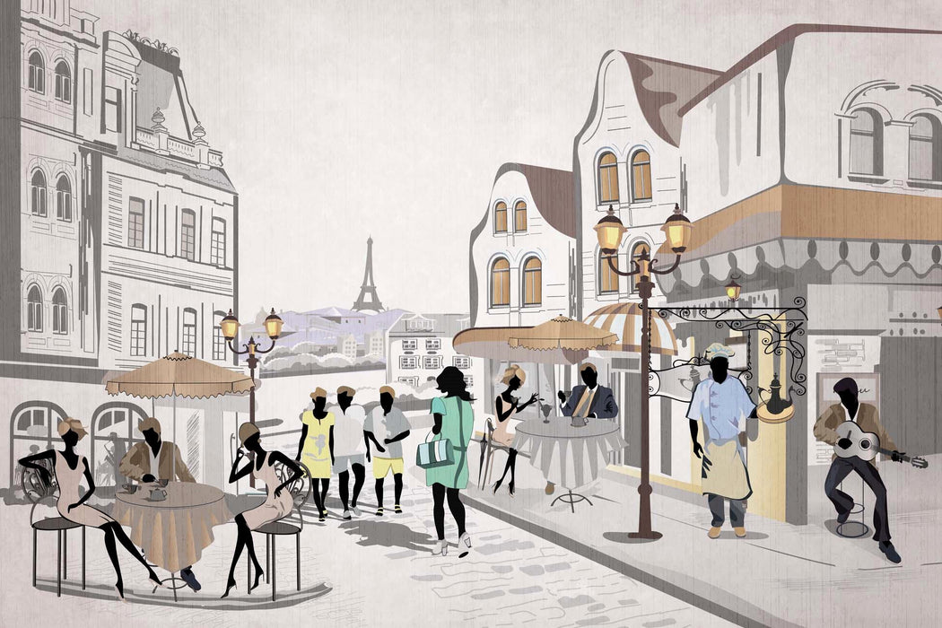 French non-woven wallpaper Paris café en terrasse brings light and elegance to your interior. A view of a jazzy chic district, wallpaper with a view of the Eiffel Tower. Its dynamic pattern will bring perspective to your room. A panoramic wall decor that will impress your guests. Easily create a unique interior with our made-to-measure non-woven wallpaper. (Colors can be modified on request by e-mail).