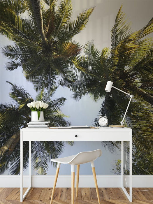 The palm trees look at the sky photo wallpaper is sublime. Artistic and exotic, the tones of this wall tapestry will brighten up your room. Treat yourself to a dreamlike landscape with this trompe-l'oeil mural of palm trees. Easily create a unique interior with our made-to-measure panoramic wallpaper. Created in France. Photo by our photographer @YoanPictures