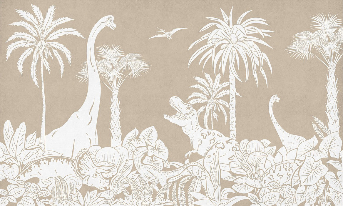 Decorate your child's bedroom with our monochrome beige dinosaur wallpaper! This illustrated dinosaur wallpaper has been designed with children's bedrooms in mind. This dinosaur mural is perfect: its soft, pastel monochrome beige color creates a soothing atmosphere. With its dinosaur motifs, this panoramic children's wallpaper brings a sense of adventure. A mixed wallpaper we love.