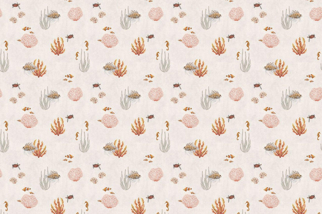 Un jardin marin délicat s’étend sur les murs, comme une plongée paisible dans les fonds océaniques. Coraux aux formes légères, algues ondoyantes et petits habitants marins semblent flotter doucement dans une eau calme et lumineuse. Chaque motif évoque le mouvement lent de la mer, créant une sensation de sérénité et d’évasion.