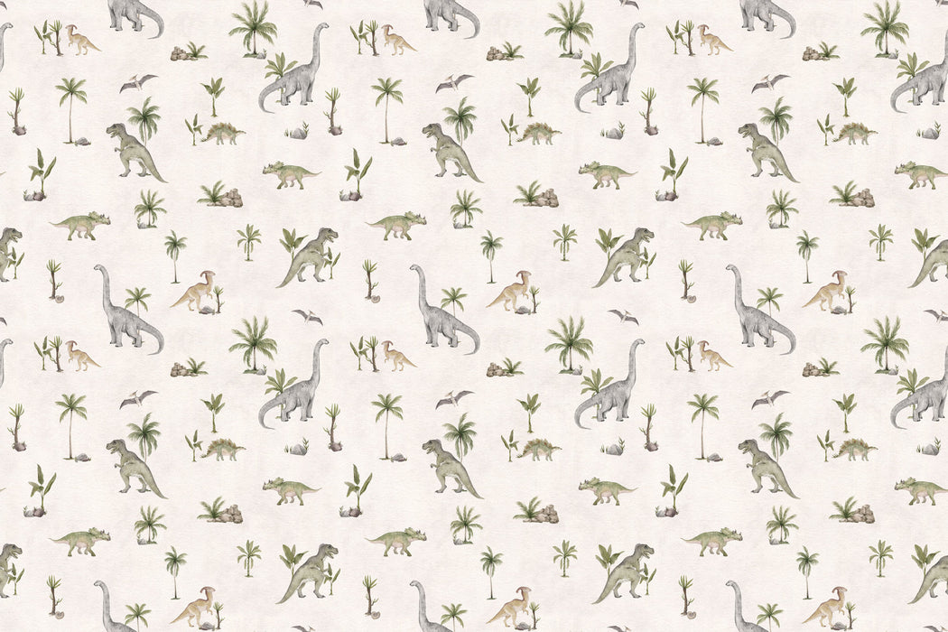 Chaque dinosaure est dessiné avec des formes arrondies et des attitudes sereines, idéales pour émerveiller les tout-petits sans les impressionner. La palette douce mêle verts tendres, gris feutrés et nuances sable sur un fond clair lumineux qui apaise le regard. Ce papier peint dino crée une atmosphère calme, parfaite pour une chambre de bébé ou d’enfant, propice aux histoires du soir et aux rêves d’aventure.