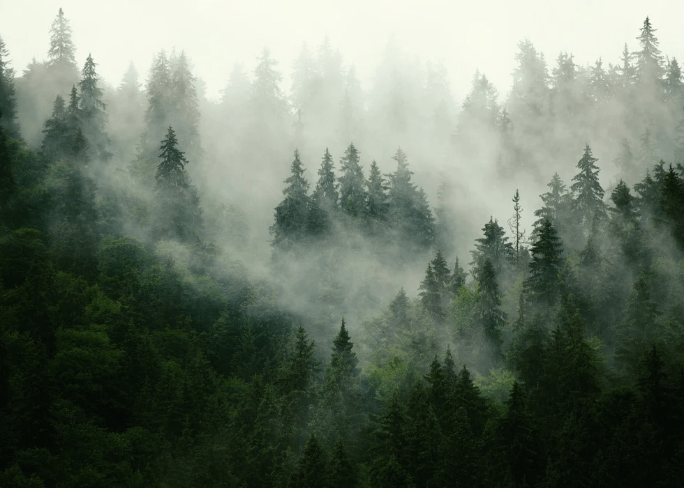 Papier peint forêt brumeuse verte