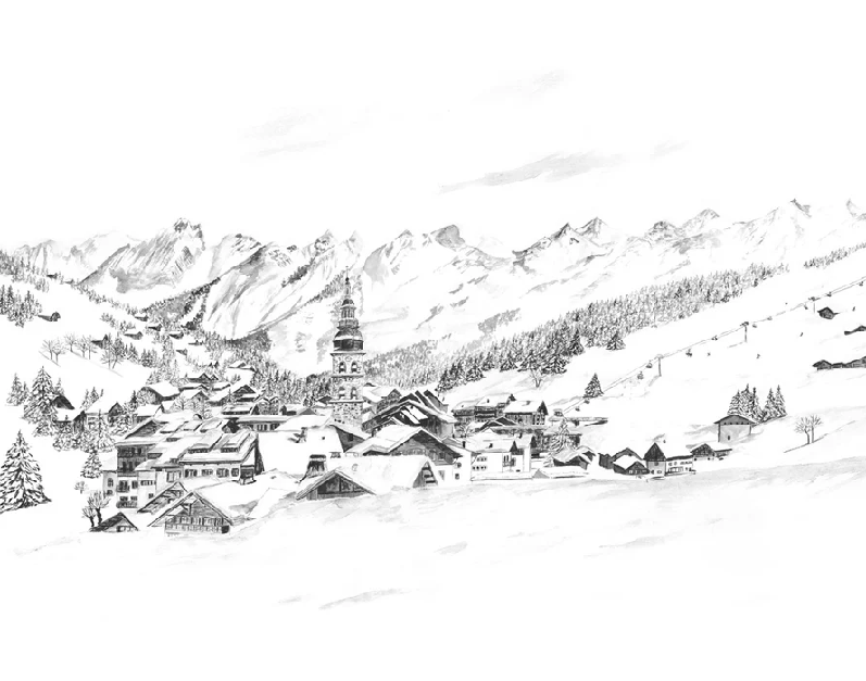 Papier peint panoramique La Clusaz en peinture - Noir et blanc