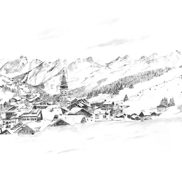 Papier peint panoramique La Clusaz en peinture - Noir et blanc