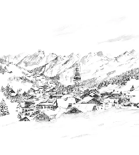 Papier peint panoramique La Clusaz en peinture - Noir et blanc